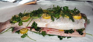 I (well, hubby) had to de-head Mr Salmon as it was too big for the biggest serving platter I had. A quick rinse later, and he was ready to be stuffed with fresh lemon (from the backyard tree), fresh dill and Italian parsley. I also put lemon, dill and parsley under and on top of the salmon so the flavours would be absorbed through. A bit of pepper, salt and olive oil and it was ready. As I was cooking on the BBQ I wanted it to be well wrapped – I used a layer of non-stick baking paper, then a layer of alfoil.