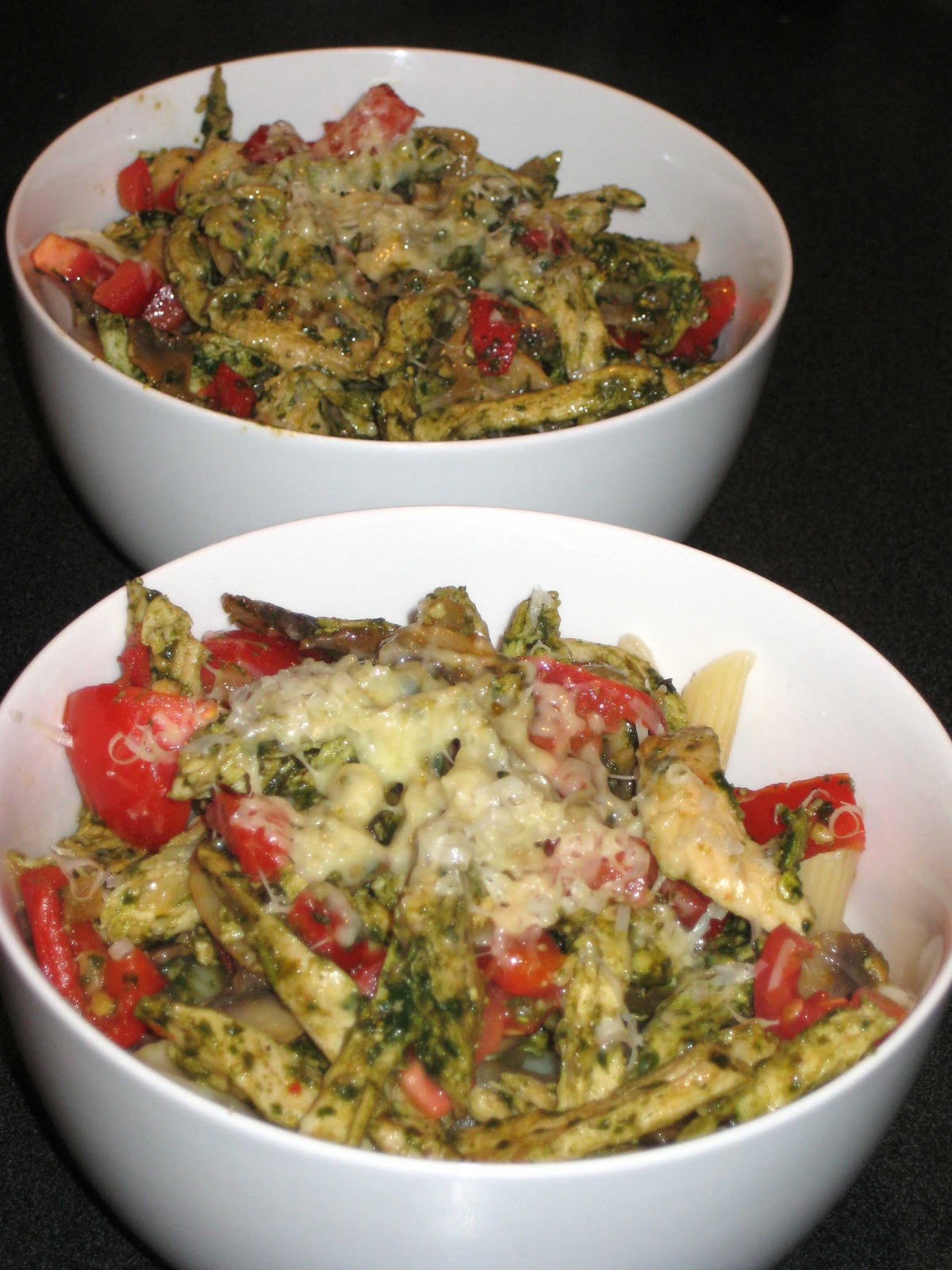 4. In a simple – and speedy – pasta sauce with sauteed mushroom, red onion, tomato, red pepper, basil pesto, grated parmesan on top – the slowest part of this meal is waiting for the pasta to cook