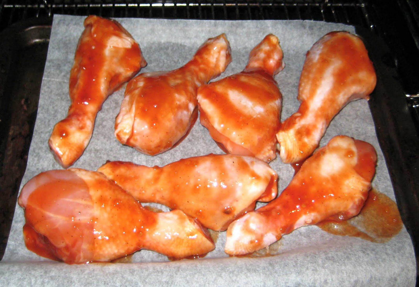 I scored {actually, I forgot, but you should score} the chicken drumsticks, placed them in a bowl, then added about 1/3 jar of the sauce. Rub the sauce over the chicken pieces making sure the sauce gets into the scored bits.