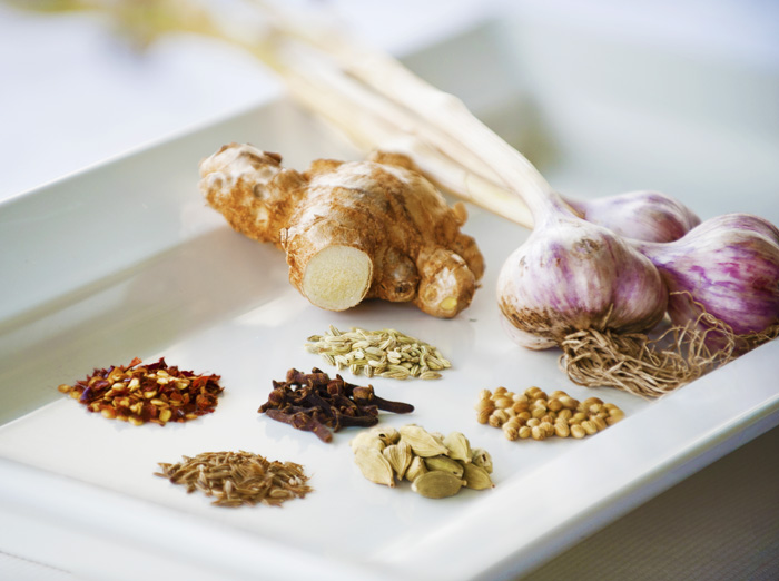| Some of the spices used – ginger, garlic {grown outside Brisbane}, coriander, cardamom, cloves, cumin, chilli, fennel |