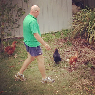 This one is hubby doing a bit of chicken wrangling this afternoon as three of our four ESCAPED. I was not happy. They are massacring the veggie garden. Hopefully his latest trip to Bunnings will sort it all out later today!