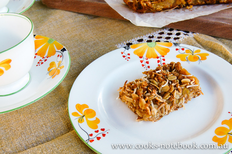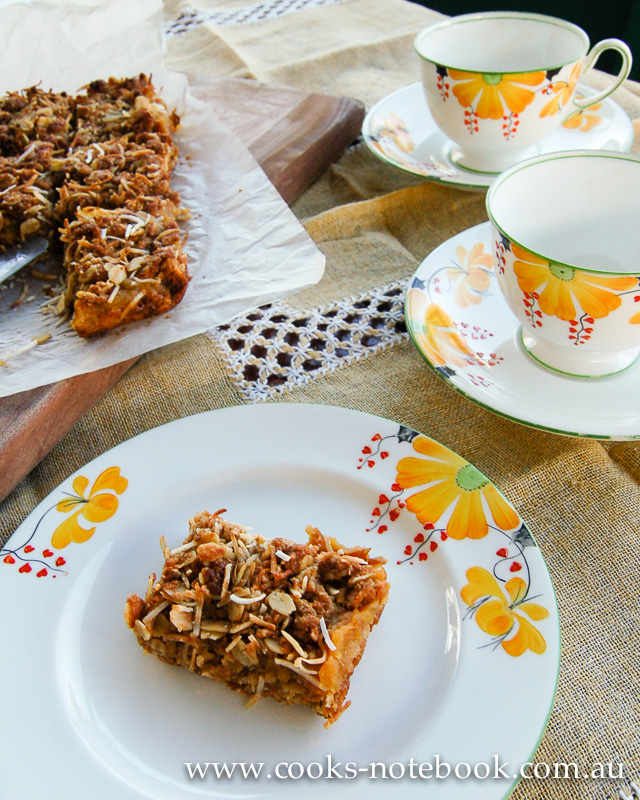 I was looking for something with apple to bake, as I had a few apples that were a bit too soft to eat, but not quite at the stage where I was prepared to feed them to the possums. Yep. It’s not just our chickens that are well fed! I was also in the mood for a slice, which is something I really don’t bake all that often. And I don’t know why, as they are quick and easy and always popular with the males in the house!