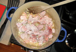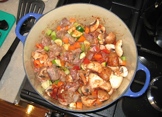 Turn up the heat on the stove and add the meat and any leftover bits of flour [this helps thicken the sauce during the cooking process]. Brown the meat, then add all the veggies, stock, wine, tomato paste, sauces and herbs. Add salt and pepper to taste [you probably won’t need much if any salt, especially if using a commercial stock].