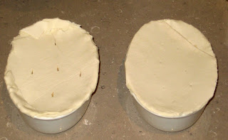 Once the filling is cooked, divide it among 4 ramekins (I used 2 cup, but it should fit in 1 1/2 cup). Top with puff pastry, cut to fit over the top of the ramekin. Brush beaten egg over the pastry.