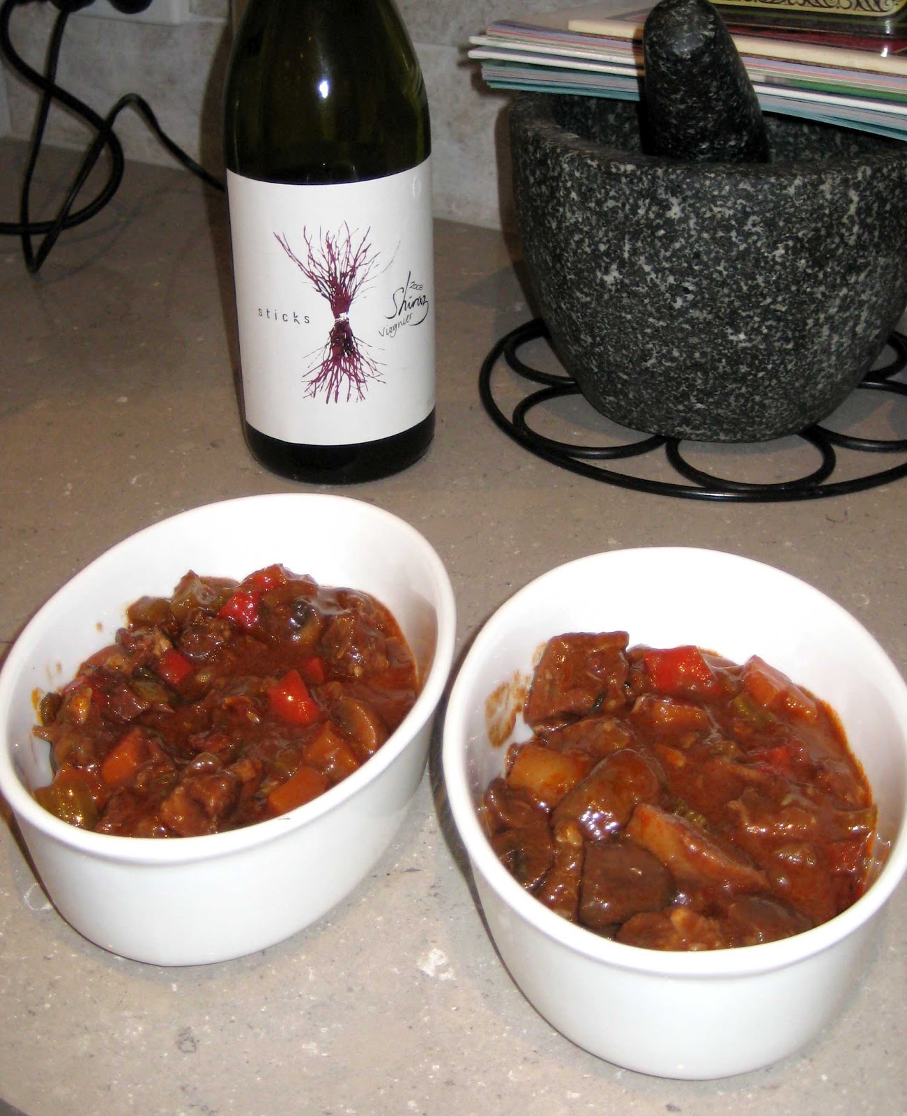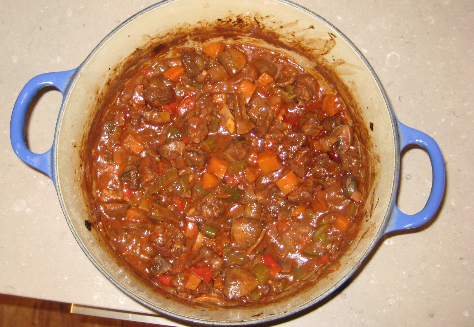 Turn up the heat on the stove and add the meat and any leftover bits of flour [this helps thicken the sauce during the cooking process]. Brown the meat, then add all the veggies, stock, wine, tomato paste, sauces and herbs. Add salt and pepper to taste [you probably won’t need much if any salt, especially if using a commercial stock].
